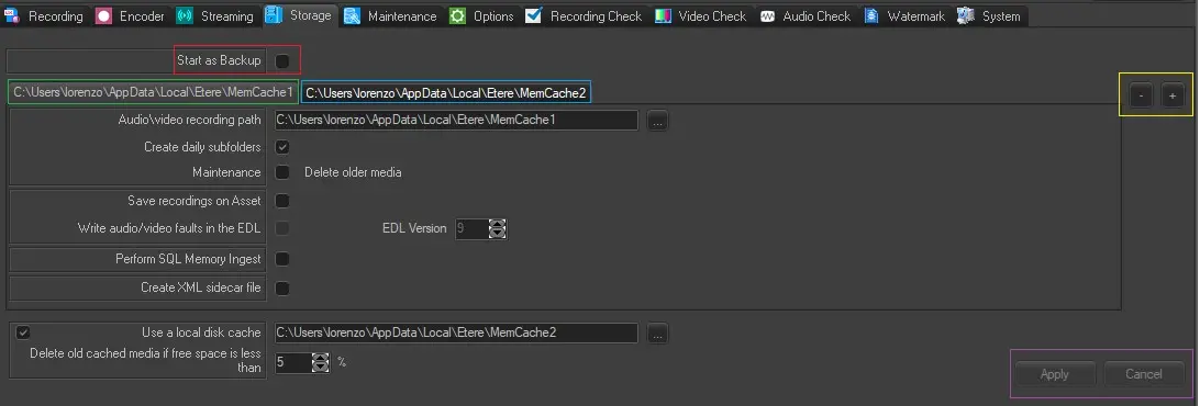 Use a local disk cache: If this option is enabled and a split path is specified, the recording is first saved into a local cache path and then moved to the specified Main recording path set under Audio\Video recording path.
