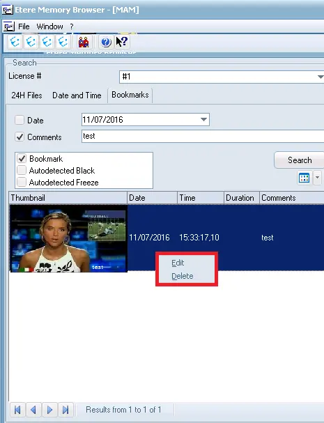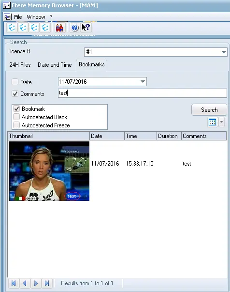 Back to main windows, now you can search the comment added in the video file in the search area, enter <test> as the key word in search field and check the <Bookmark> checkbox to search for comment created using the Bookmark icon. The search result returned the video file with comments <test> added in the video file.