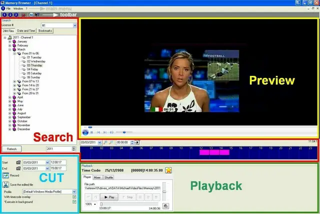 Select any station to start the Memory Browser in the main windows. The Memory Browser is mainly divided into 4 areas, namely the Search area, Preview area, Cut area and Playback area.