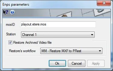 •Restore Archive video Files: Set here the identification of the Media Object Server, the station to which the news broadcast is related and the T-workflow to be used for restoring video files: