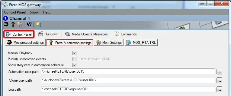 •Clone user path: Indicate the path to the folder where the clone automation is installed. This folder will be used to publish the Running Orders coming from the Newsroom system (e.g.: ENPS).