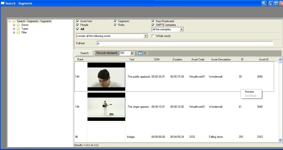 •On the right-hand side, segment properties (artist name, roles assigned, SOM and EOM, Insert on the playlist) are displayed, being also possible to preview and download (if available) the low-res video of the segment,