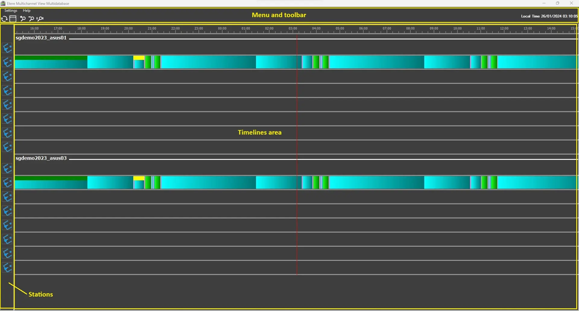 • Timelines area: The main area of the module, where the timelines representing the current-day playlists of each station are displayed. This area is divided into multiple sub-sections that can be expanded/collapsed according to how many databases are configured in the settings.