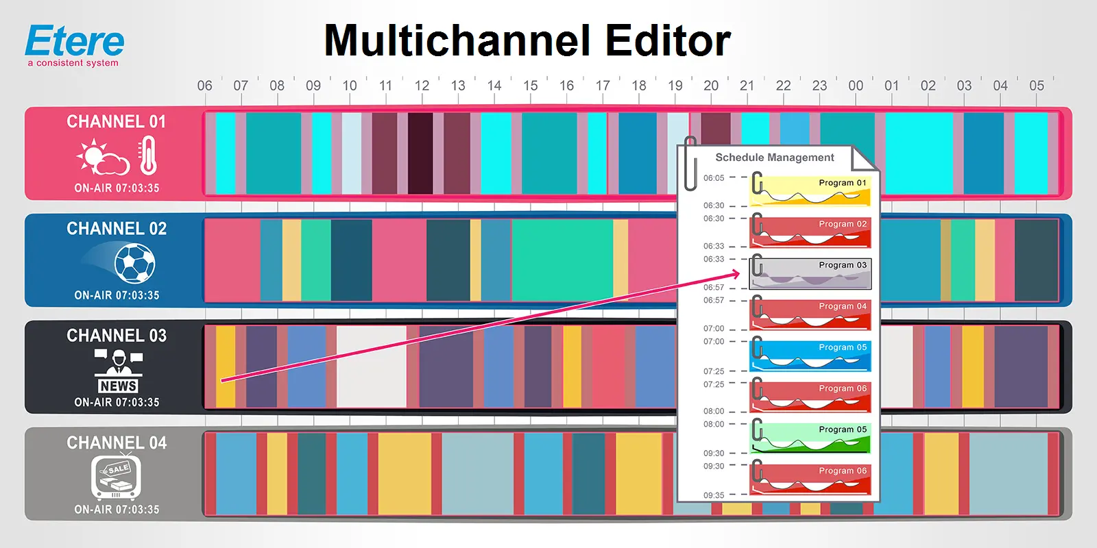 Etere Multichannel Editor is a utility that allows stations with more than one channel to have a global view of all schedules. It will enable changes to the schedule and allow you to see what is on air on all the channels at any moment. The software is straightforward to use, with graphics that help explain in more detail: