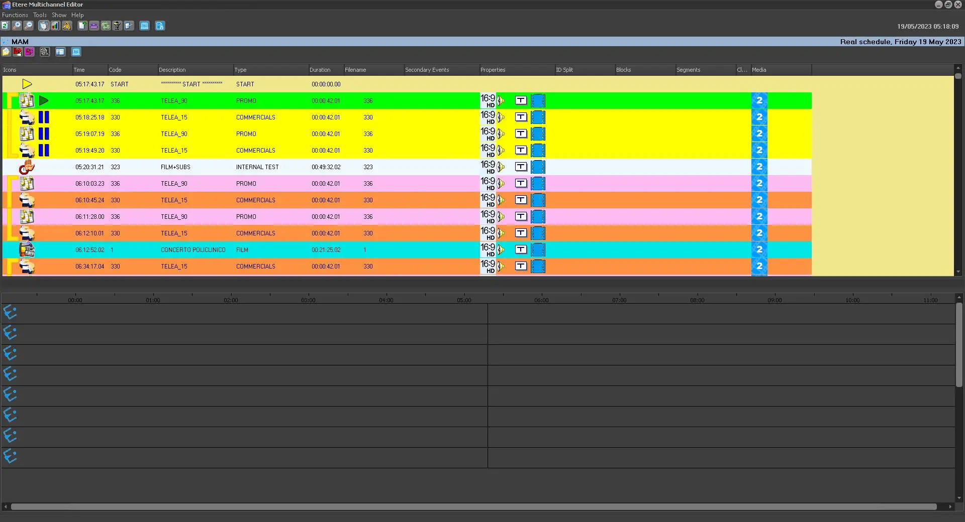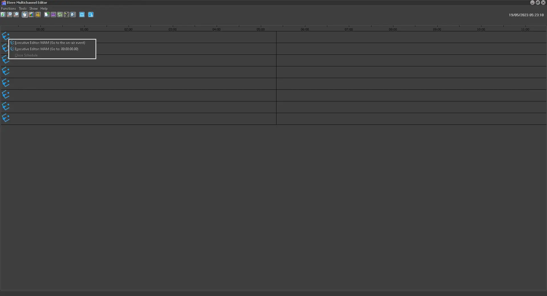 Once you have opened the schedule, it is possible to right-click on a specific channel and select the Executive Editor option. It will allow the operator to manage its daily schedule(i.e., insert events, move events, delete events, etc.) and then publish (Multichannel View_secondbutton05) performed changes to the automation schedule, all directly from Multichannel Editor, etc.