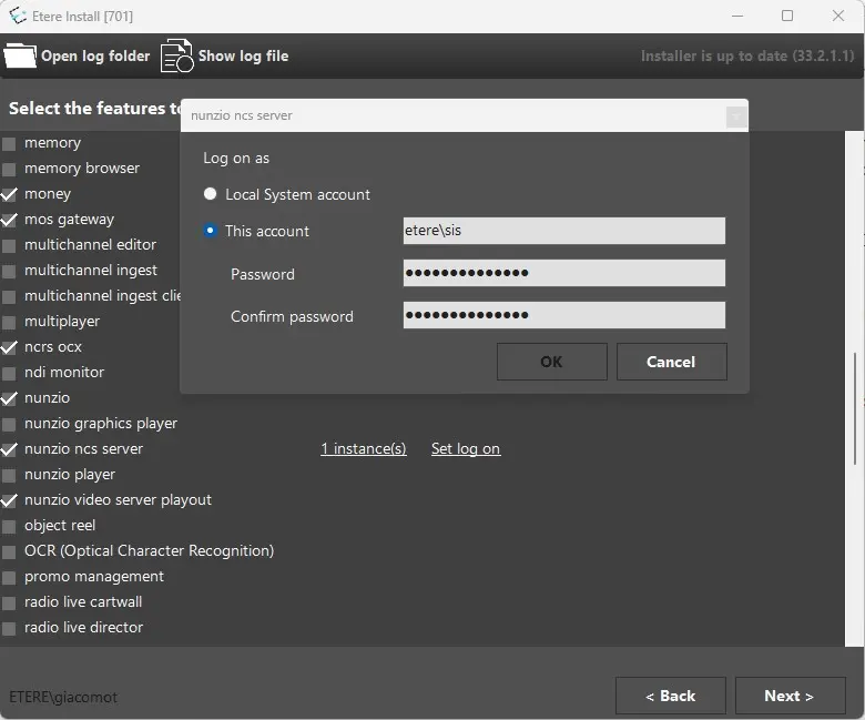 Select the given function and then select the logon user which should run the Service; then complete the installation process.