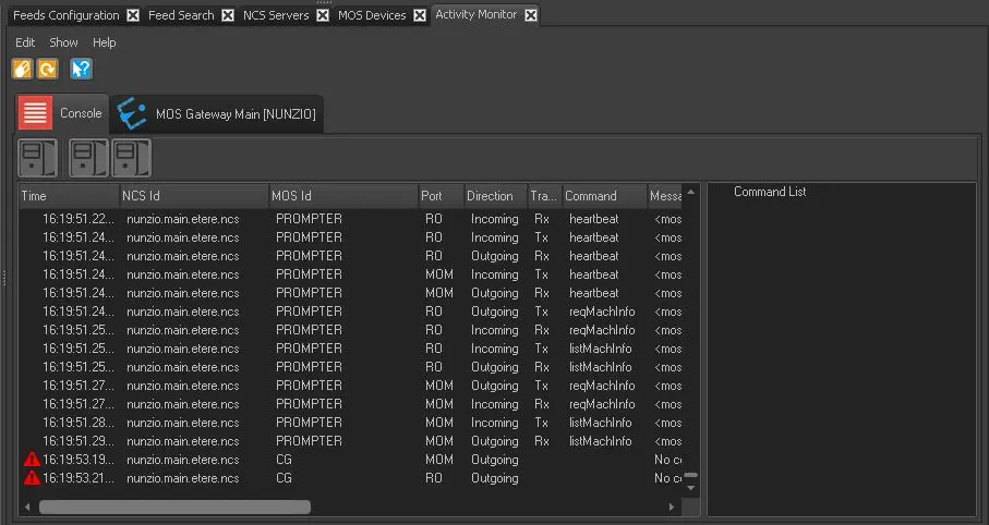 Activity Monitor console displays all the incoming and outgoing messages between NCS server and Mos Devices and set on the MOS Gateway. Activity monitor