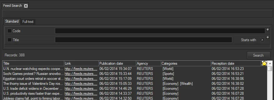 Display all the feeds available in the system (e.g. Reuters politics). Feeds can be added by pressing the [New] button and compiling the parameters: