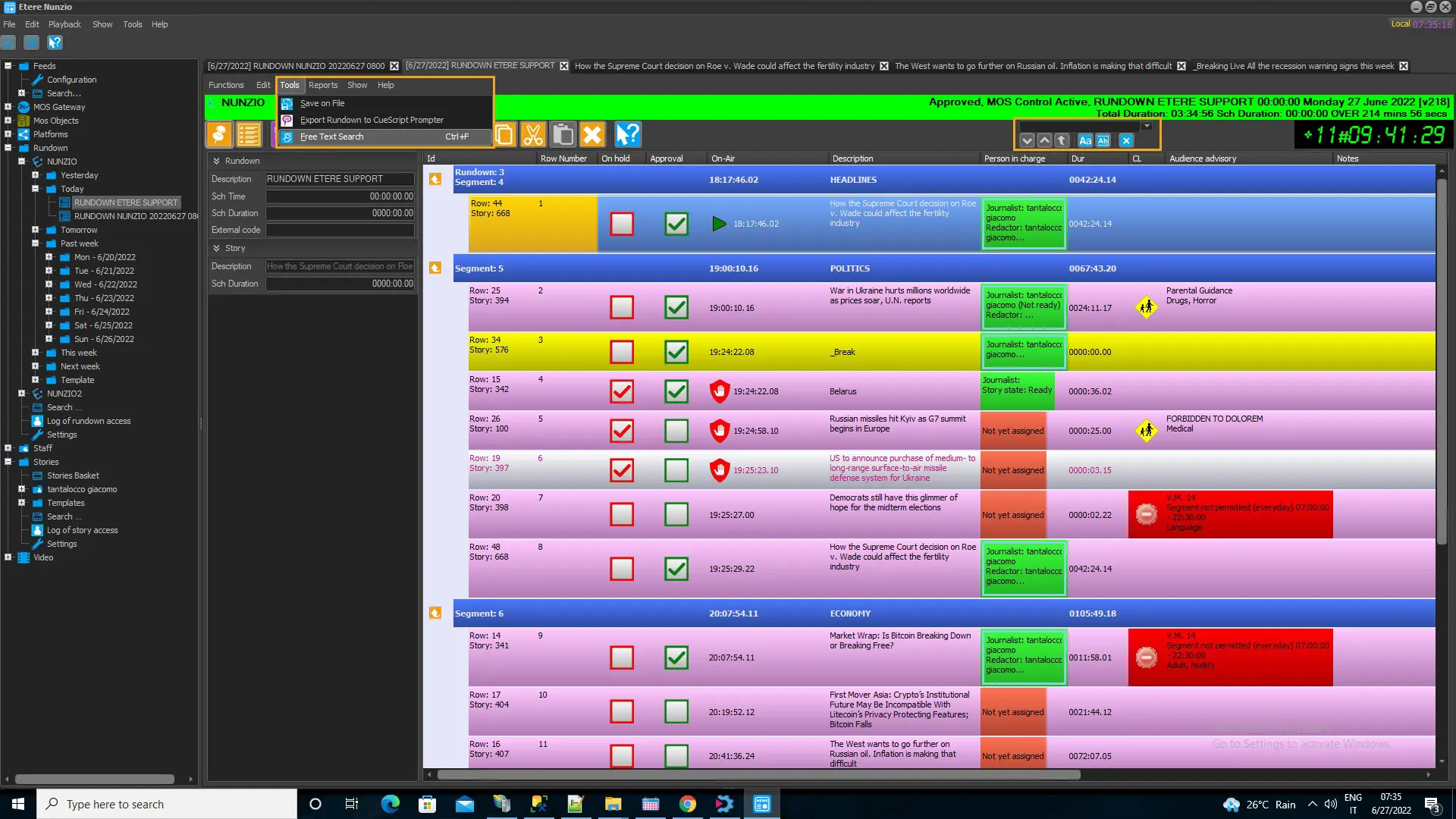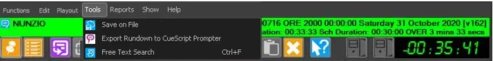 Save on File: This function save the current Rundown on plain text file (.txt) or export as Nunzio format (.xml)