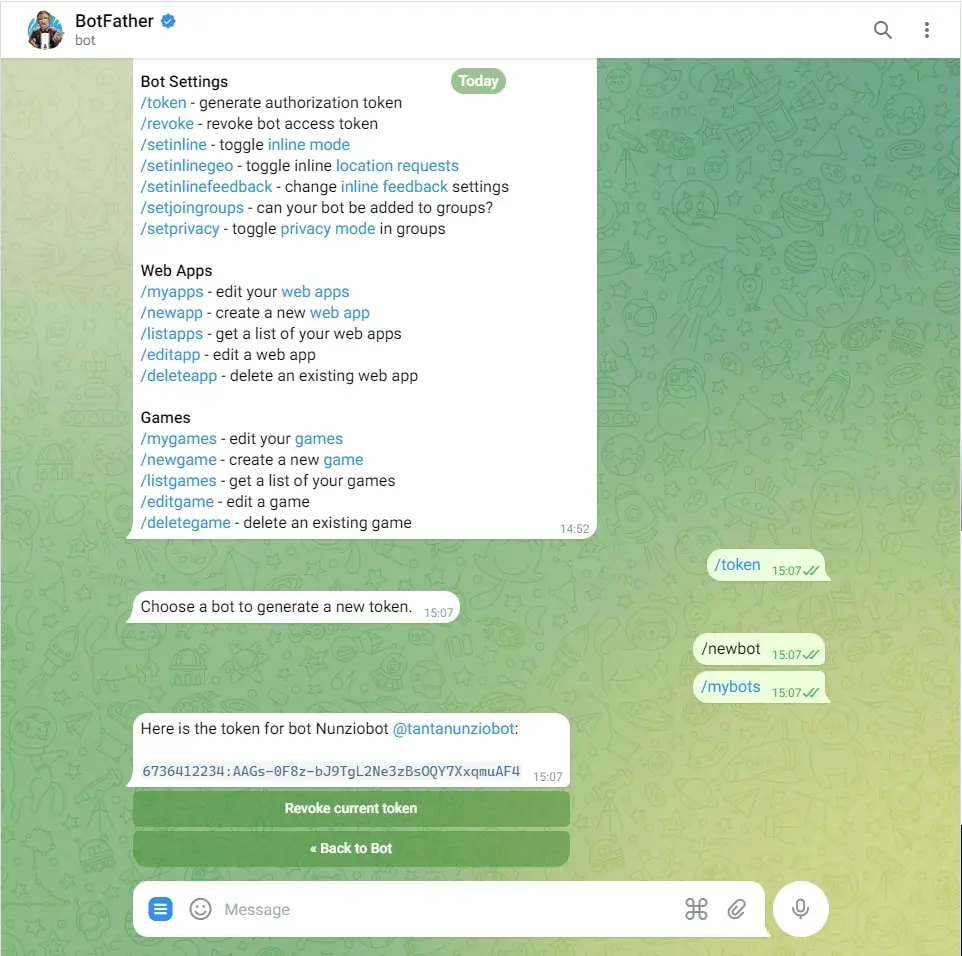 We can ask to display the token, simply sending the /token command. The response would be something like: