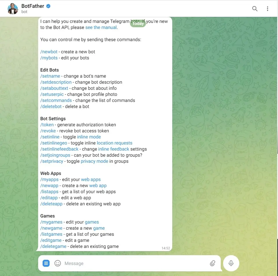 - By prompting the /start command, BotFather will be active and will provide a list of all its available commands for the first configuration;