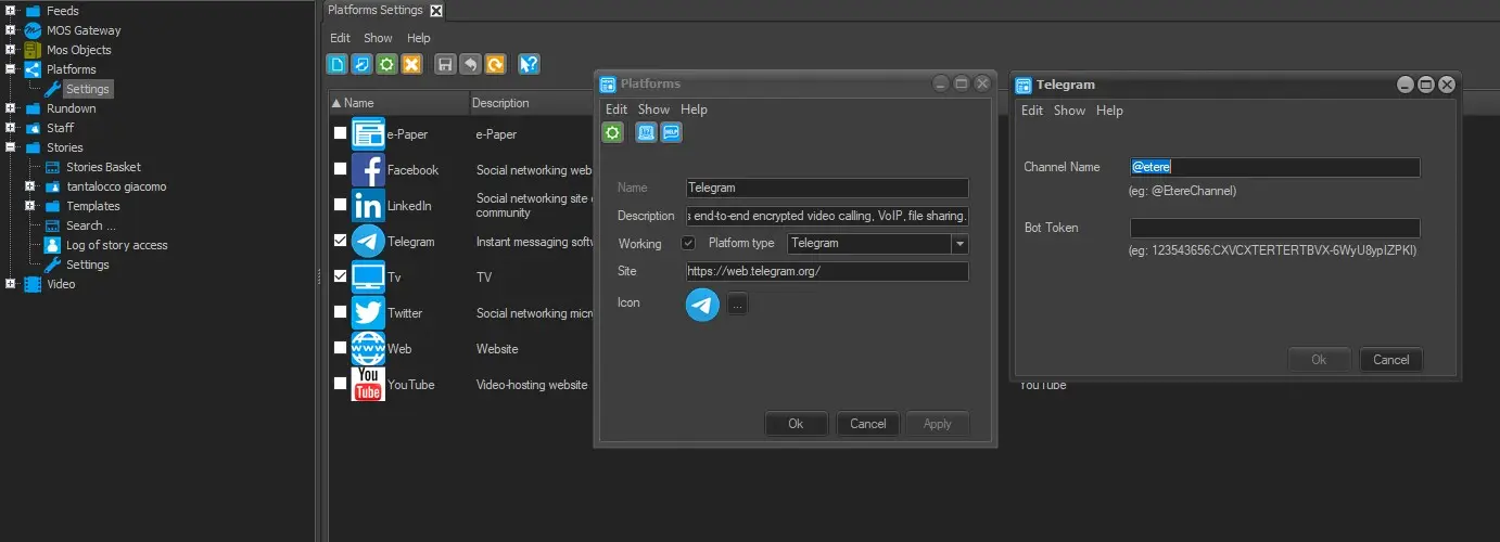 The Platforms tree node enable you to configure the destination platforms for Etere Nunzio content when a new story is saved.