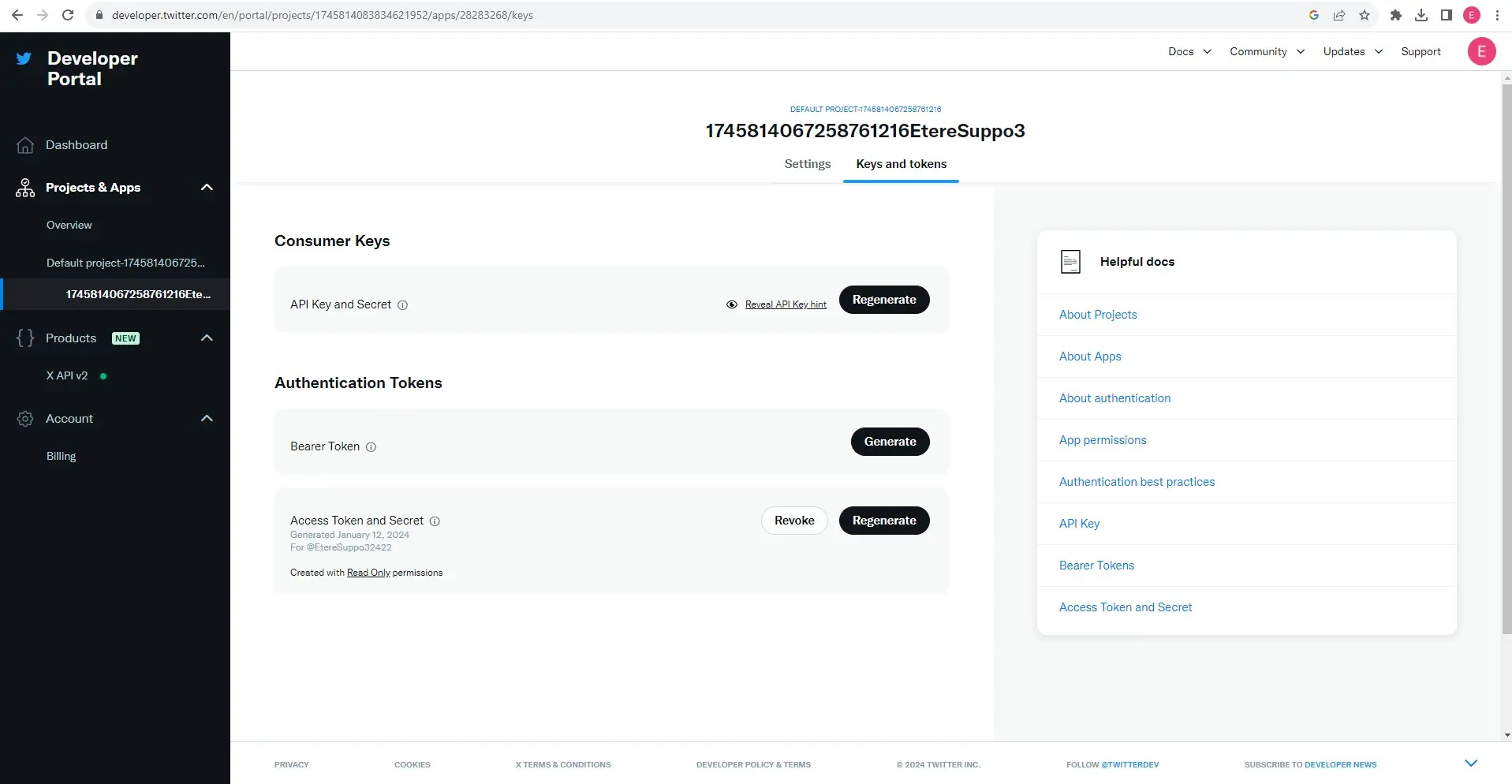 3. From Twitter/X Dev Platform, request/generate the following informations: