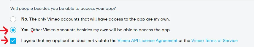 5. In the question "Will people besides you be able to access your app?" select yes and enable the checkbox "I agree that my application does not violate the..."