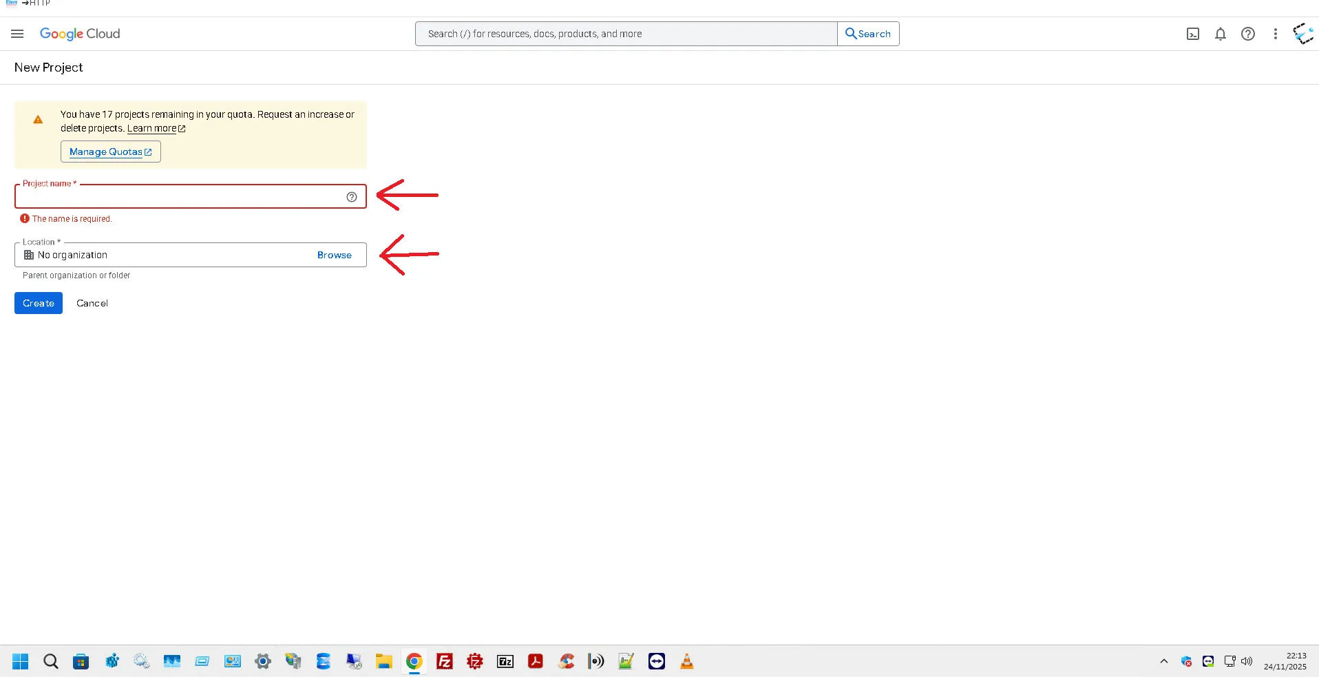 3. In the next form set, Project Name and Location (this field can also be set to "No Organization"). Then click on Create