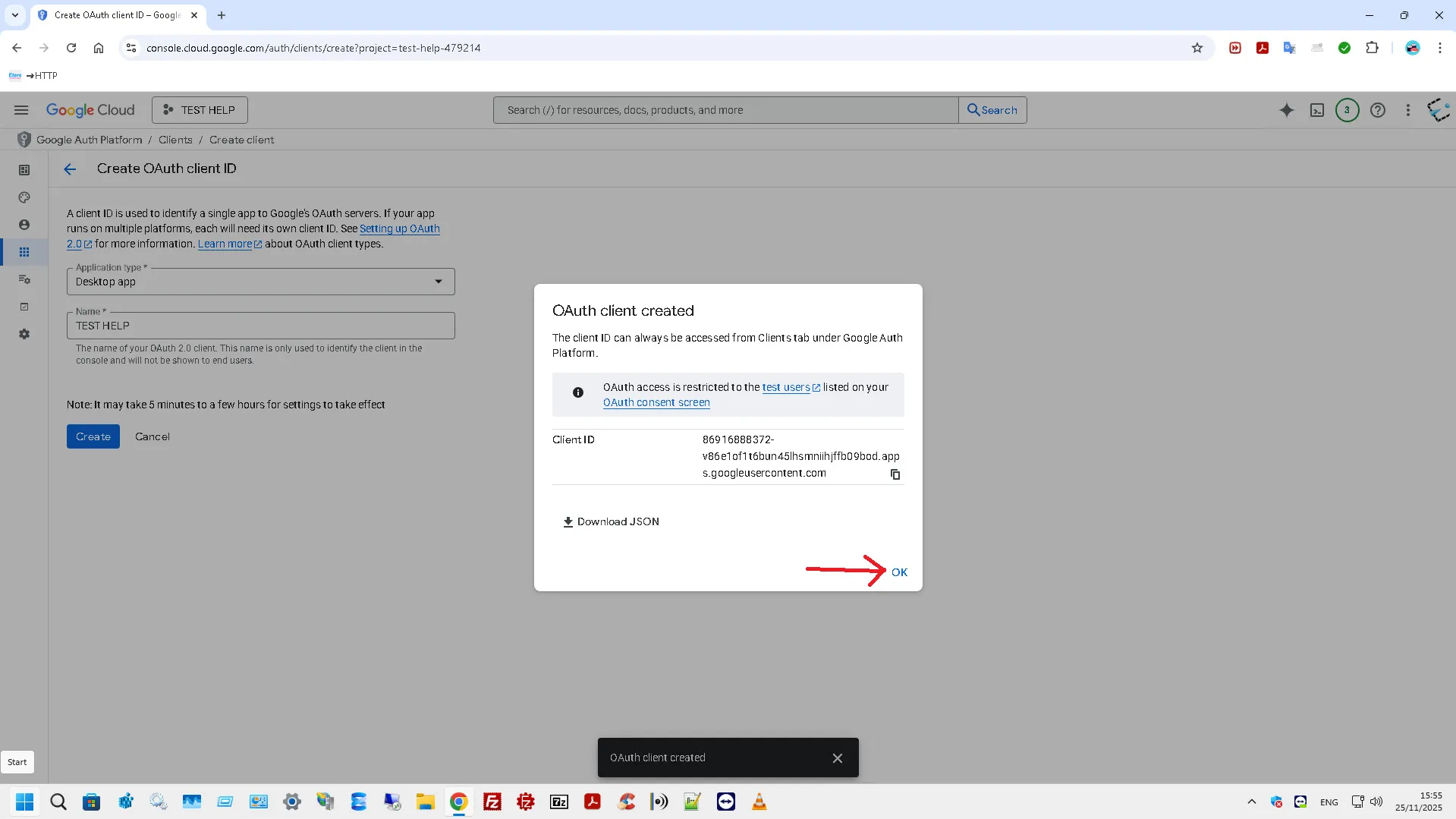 11. The form with Client ID the will be displayed and the option to download the "JSON" file. Click OK.