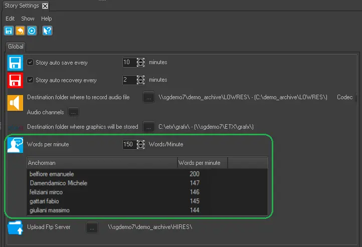 In Stories Settings, you can define reading speed for each anchorman by setting a different value in the “Words per minute” column.