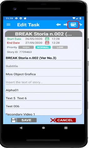 When mobile application is launch, you can edit the task by selecting Task from Etere Nunzio menu to open the Edit Task dialogue.