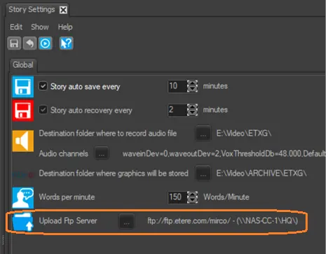 In Etere Nunzio's Story Settings, the “Upload FTP Server” parameter is used to set the FTP Server where you can upload the video file from the (Android) mobile application.