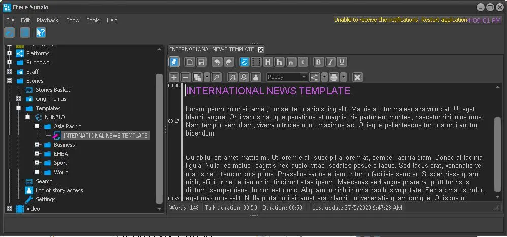 The Templates node contains all story templates available in the station. Templates are grouped by category, e.g. Business, Sport, World, etc.