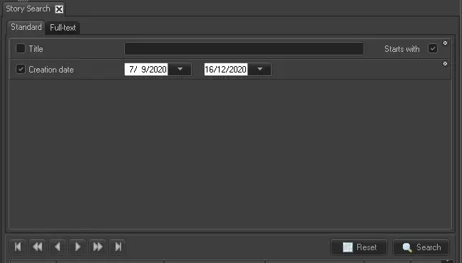 The Search node allows an accurate search and selection of stories matching a given criteria (e.g. title, creation date, etc.).