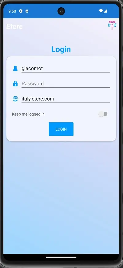 Once there, insert User, Password and Domain. It worth mentioning that the Domain is taken by Etere Configuration and is not possible to insert it from scratch into Etere Nunzio App form.