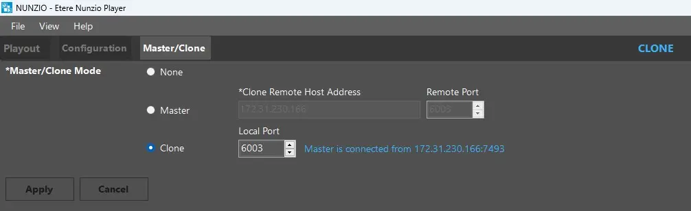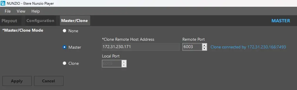 Start as: Select if the current Nunzio Playout instance should start as Master or Clone.