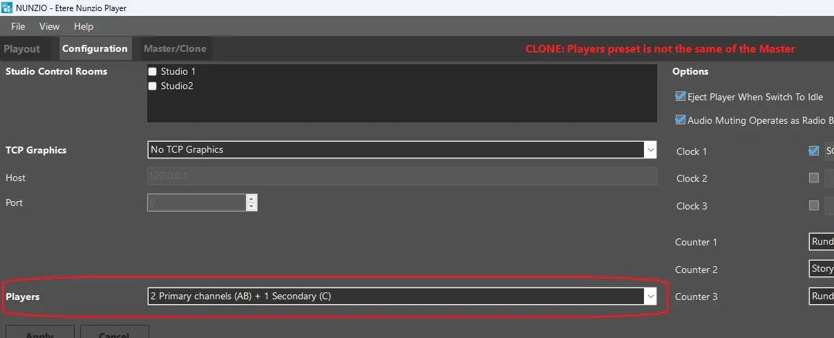 - Obviously the players configurations (ABC) have to be the same on both Master and Clone, otherwise the Clone will not work, showing the error message “Players preset is not the same of the Master”.