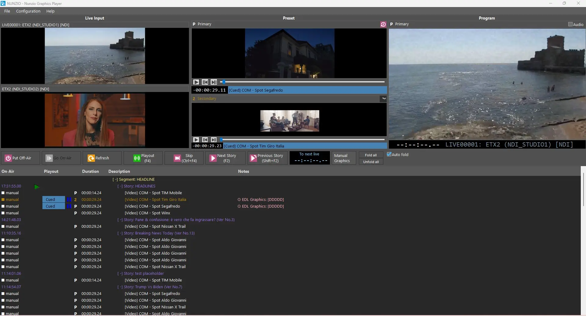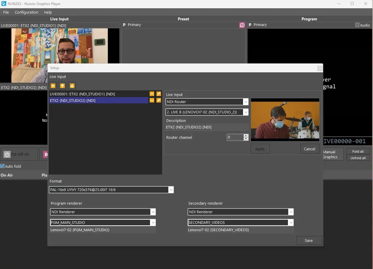 In the Live input section we can assign multiple live feeds, either SDI or NDI. The preview of the selected input will be immediately displayed (if available).