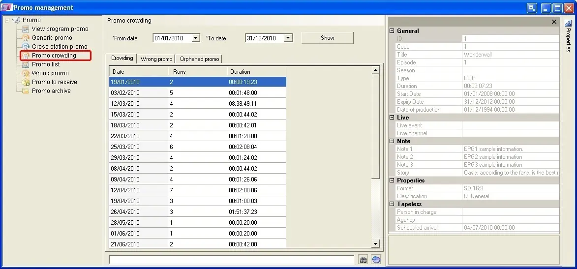 The Promo Crowding section permits the station to keep its trailer crowding always under control, this by providing detailed per-day information about all trailers matching the following criteria: