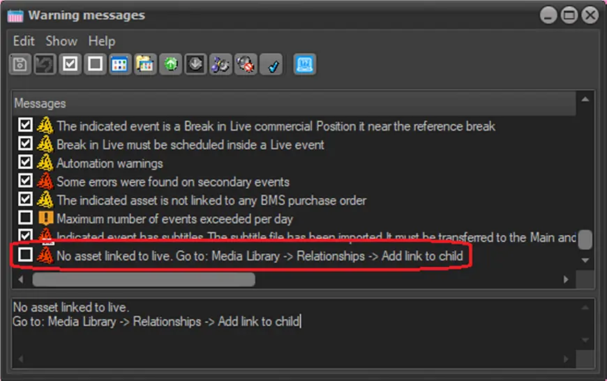 From Etere version 33.2.182.6699, it's possible to schedule LIVE assets with a linked child asset and display a warning in case the link to the child does not exist.