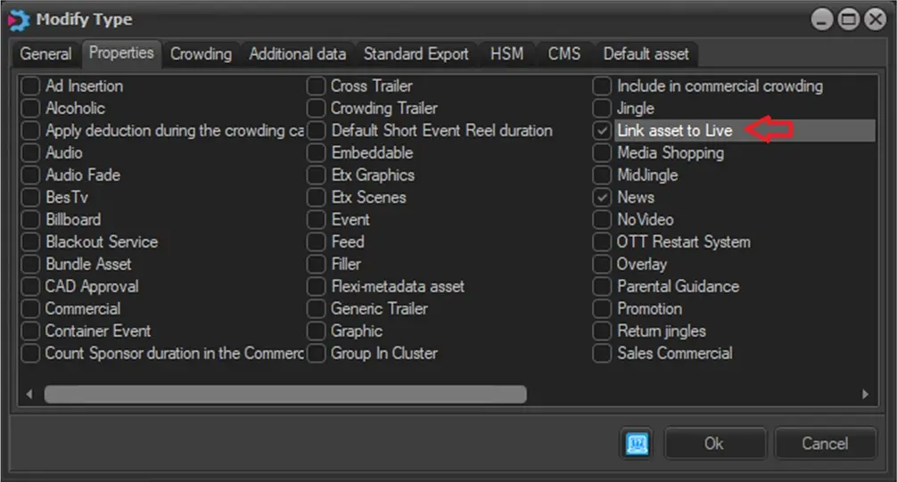 To do so, the LIVE asset's type must have the property Link asset to live enabled.