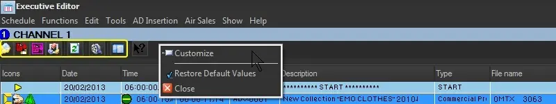 The toolbar positioned between the main menu and the schedule grid can hold a custom arrangement composed of items from the menus mentioned above, including: