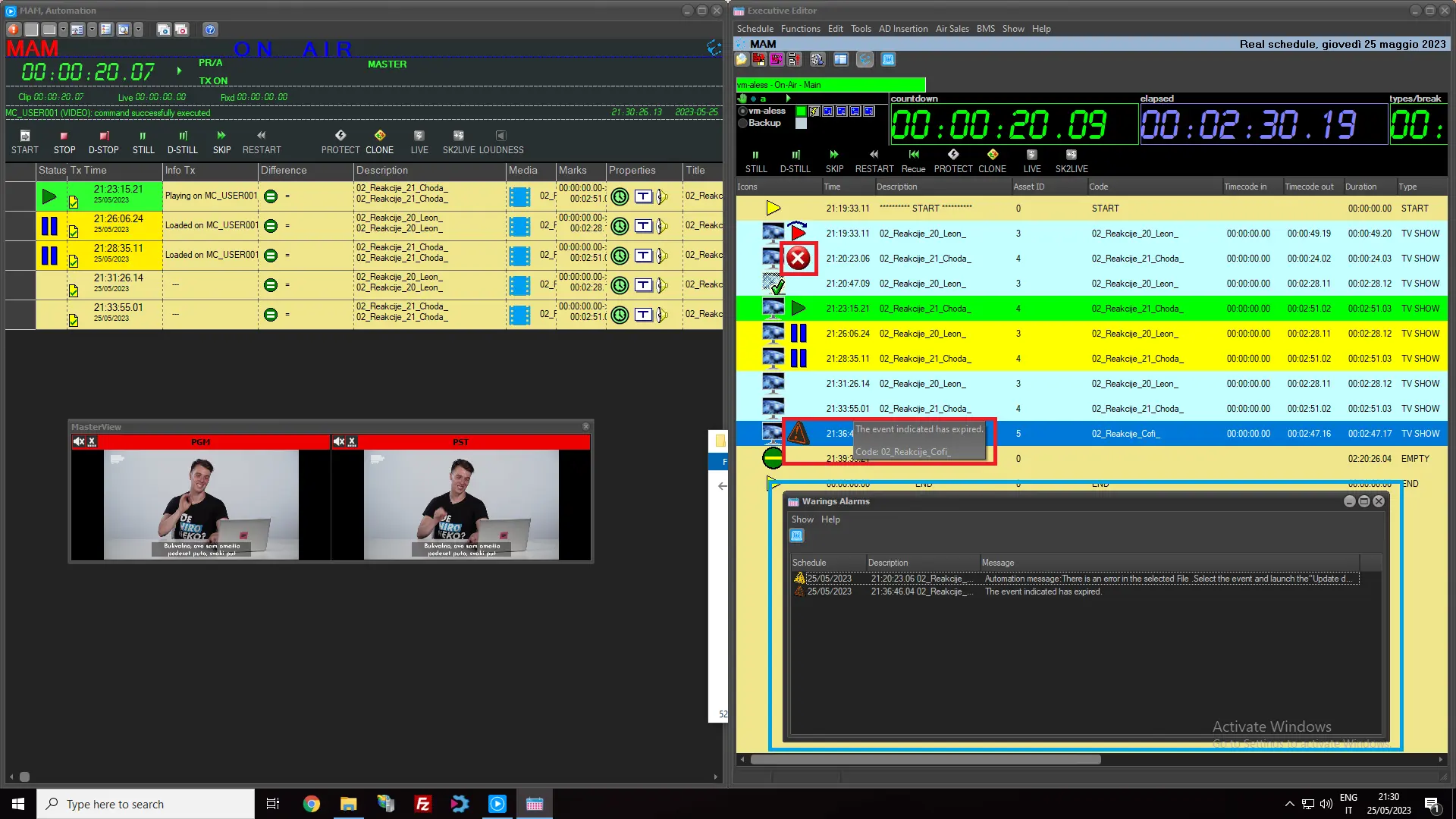 Executive editor allow to reproduce alarms when a warning appears in the schedule.