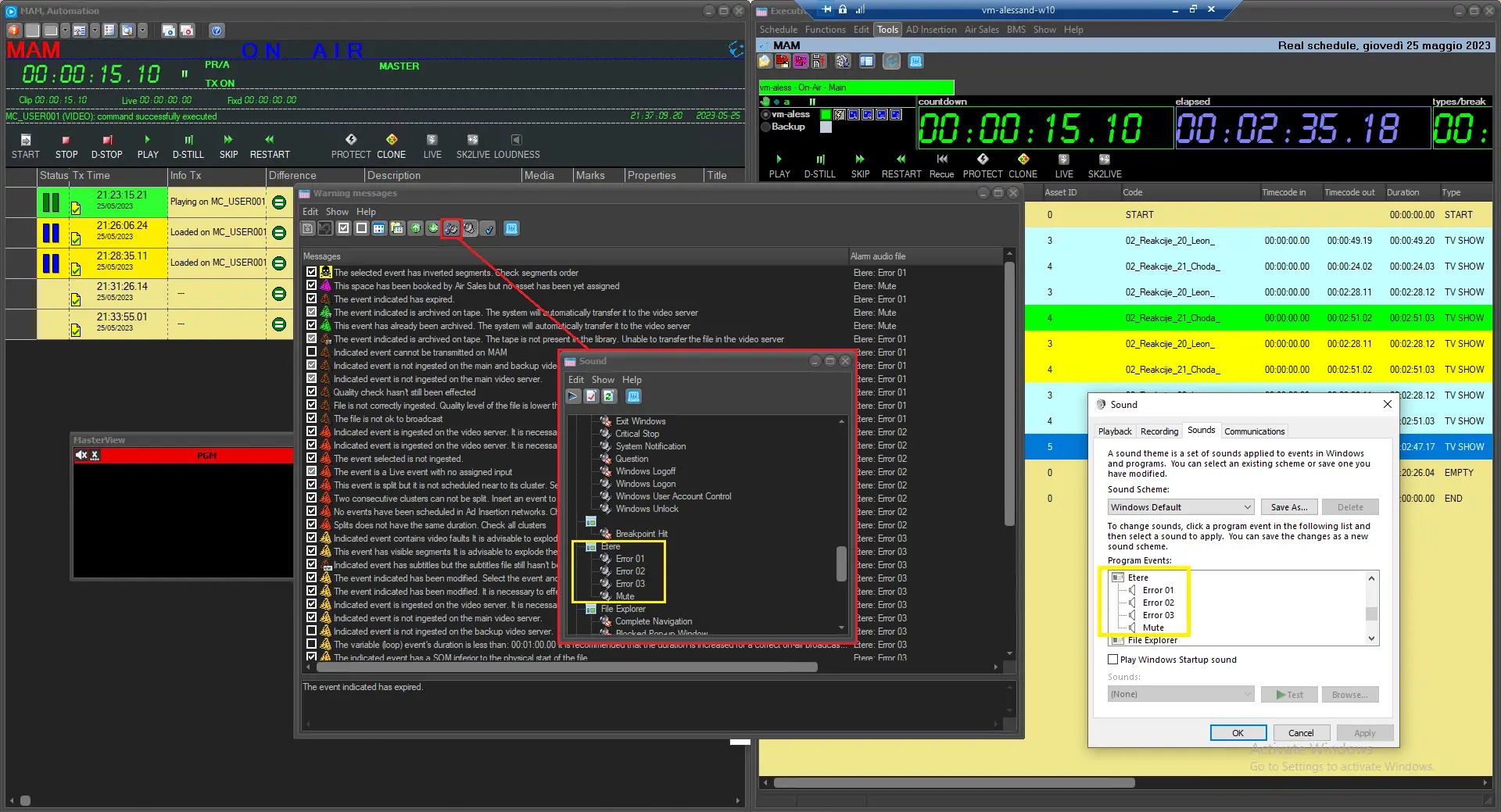 This functionality need to be activated and it will be only for the current ETERE PC. To activate it, click the button Activate audio alarm for this ETERE PC on the toolbar (or select the option with the same name in Edit menu) and restart Etere Scheduling.