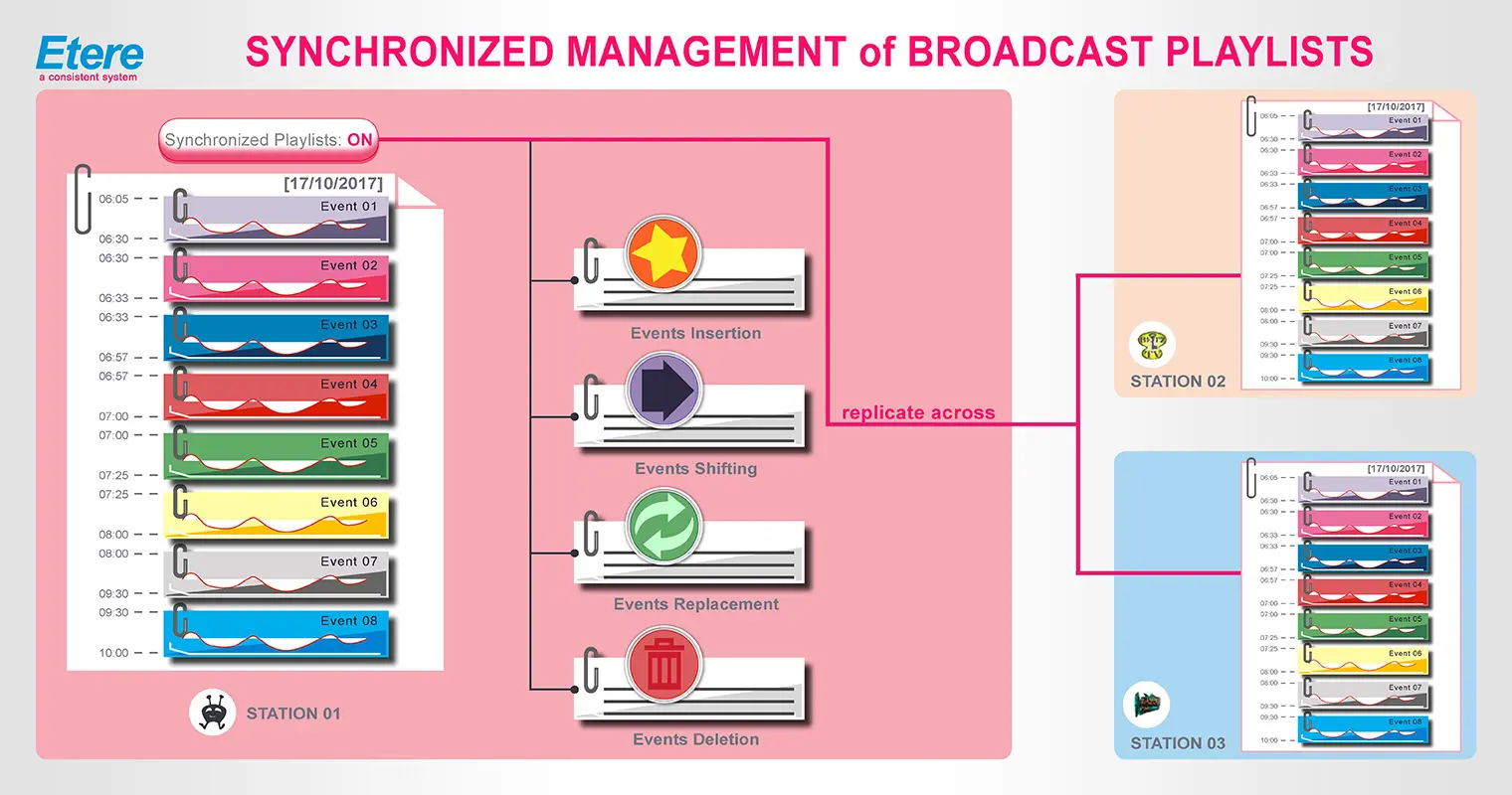 The "Synchronized Playlists" feature provided by Etere Scheduling allows to manage from a single schedule the daily schedules of other different stations; this feature permits Executive Editor to work in a truly multichannel mode, where all events insertions, shifts, replacements and deletions are automatically replicated in the linked stations, being also possible to display a warning each time a scheduled event changes.