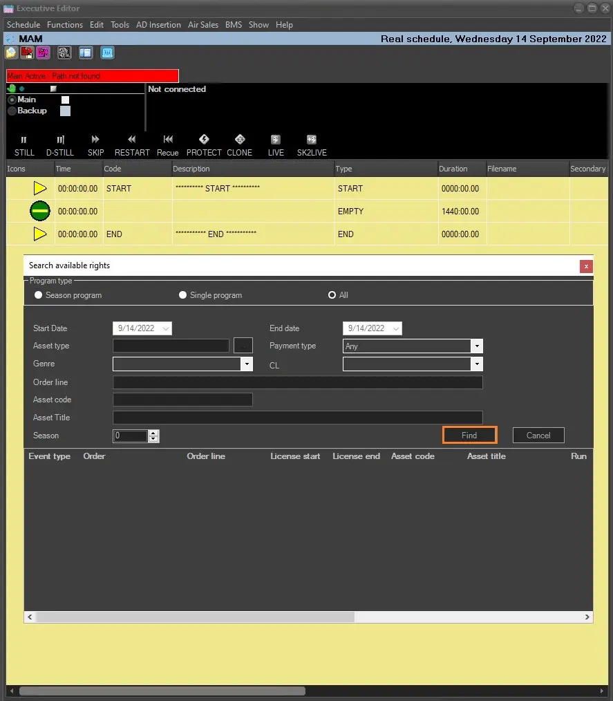 The BMS menu allows to search for available valid rights for the events and insert them into schedule.