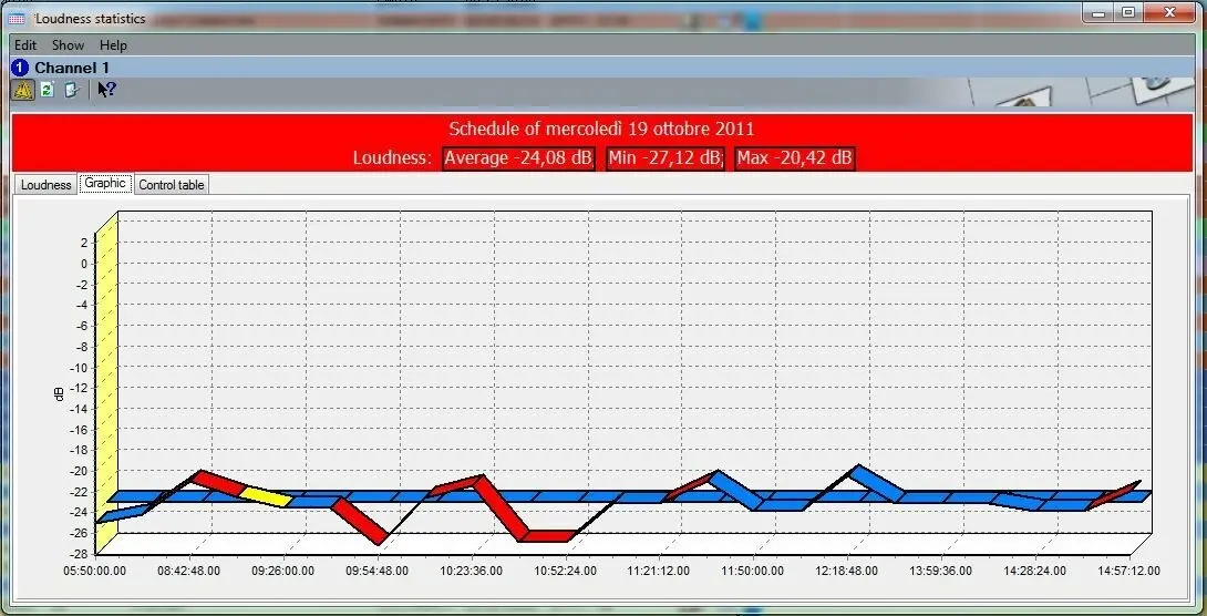 This area provides a graphical view of the loudness variations present in the schedule. This area is formed by a 3D line chart "loudness vs time" containing two lines, one indicating the "daily loudness average" (e.g. -22 dB) and another one indicating the "events loudness variations" (e.g. -24.13 dB, -23.55 dB, -24.36 dB, etc).