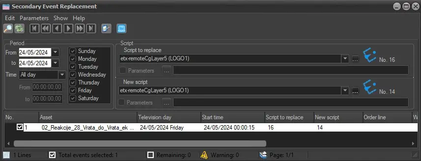 Filtering by scripts might not seamlessly locate the specific graphic objects, due to same script used on multiple graphics. In view of this, the "Parameters" filter was introduced to enhance the replacement of secondary event: