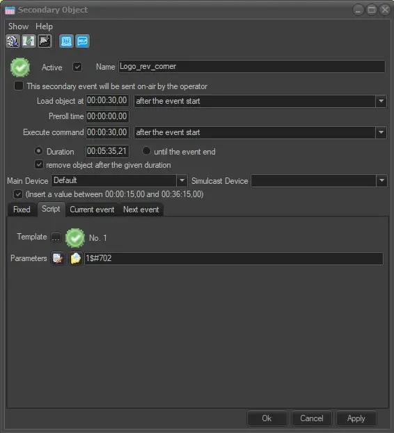 The Secondary Object event (formerly called Asynchronous title) allows to send logos (fixed graphics), script files (command strings) or event information (current / next) through a certain device using specific parameters.