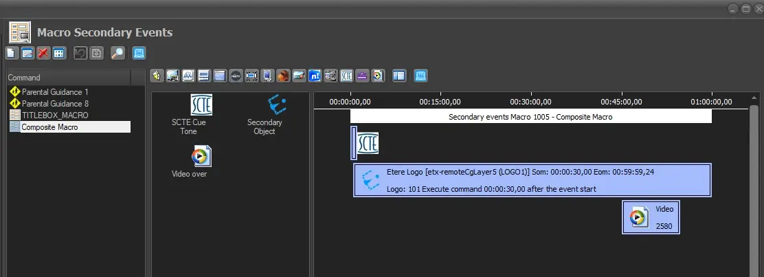 A Macro Secondary Event is simply a group of secondary events created to permit operators to have predefined groups of secondary events to facilitate their batch insertion. For example, a Macro Secondary Event can group in a sequence of various secondary events including a switch channel, a fade, a logo and a crawl: