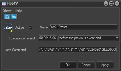 Json Command: Specify the JSON command string with the command value to manage the DAS type secondary events. The possible command values are 1 (Preset), 2 (Take) or 3 (Clear).