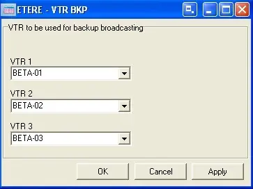 In the Etere Executive Editor module, navigate to the "Show" menu and select the "VTR for manual playout" function, it will show up a VTR status bar, then, pressing the [Edit] button located on the Backup VTR panel, it will be possible to select up to three -previously configured- VTR's (BVW75 compatible) to be used for the playout: