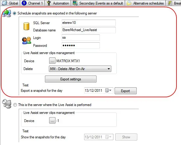 NB: Please note that the proper export of broadcast schedules is in charge of the Etere F90 application, which must run on the main server and will periodically export the schedules from the Main server into the Video Assist server.