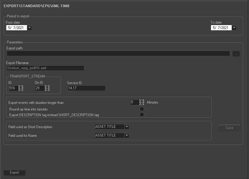 •Export filename: Exported files will be named according to the following format: station_epg_pidXX.xml, where station is replaced with the station name and XX with the Service ID for which the export has been performed,