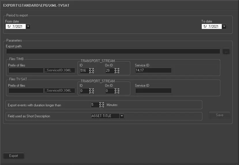 The EPG XML-TVSAT export allows creating an XML file (with a .XML extension) containing the broadcast playlists (and related scheduled events) for a period of time of up to 7 days.