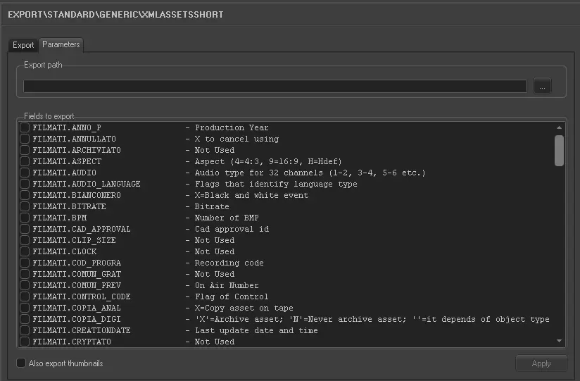 The XML Assets Export creates an .XML file containing all asset data including their relative EDLs. The name of the file created is Etere_asset_xxx.XML where xxx is the station identification number. In this way it is possible to define an export path for every station. You can also specify exactly which asset data you require by selecting which fields to export (under parameters).