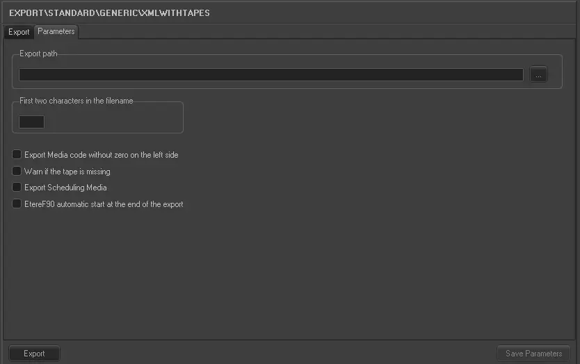 The XML with tapes Export function creates an .XML file containing the schedule of the date specified on the front 'Export' screen and in the Export path in the Parameters section. This file will have the name XXyyyymmddLUN.xml where the first 2 characters are user-defined in the Parameters section and last 3 represent the days of the week: