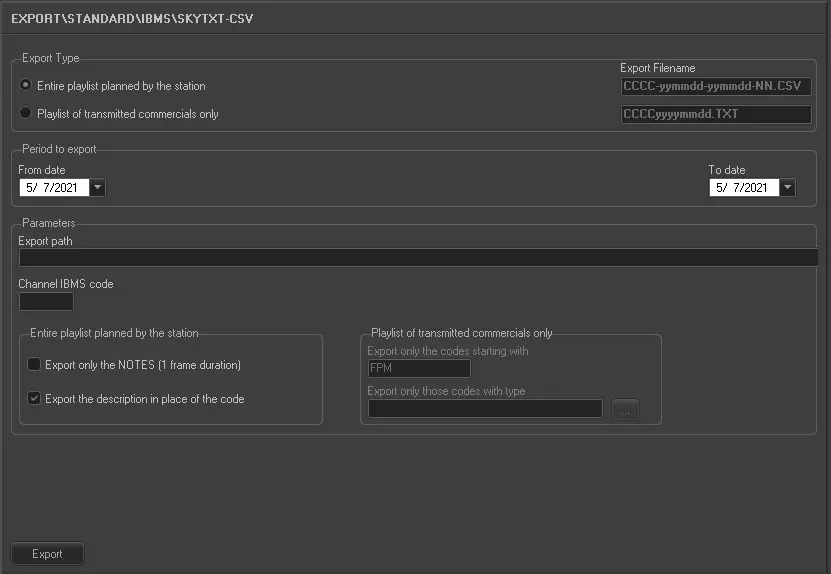 The IBMS SKY TXT CSV export allows generating two different kinds of files, the entire scheduling of a certain period or only the commercial within a given dates frame.