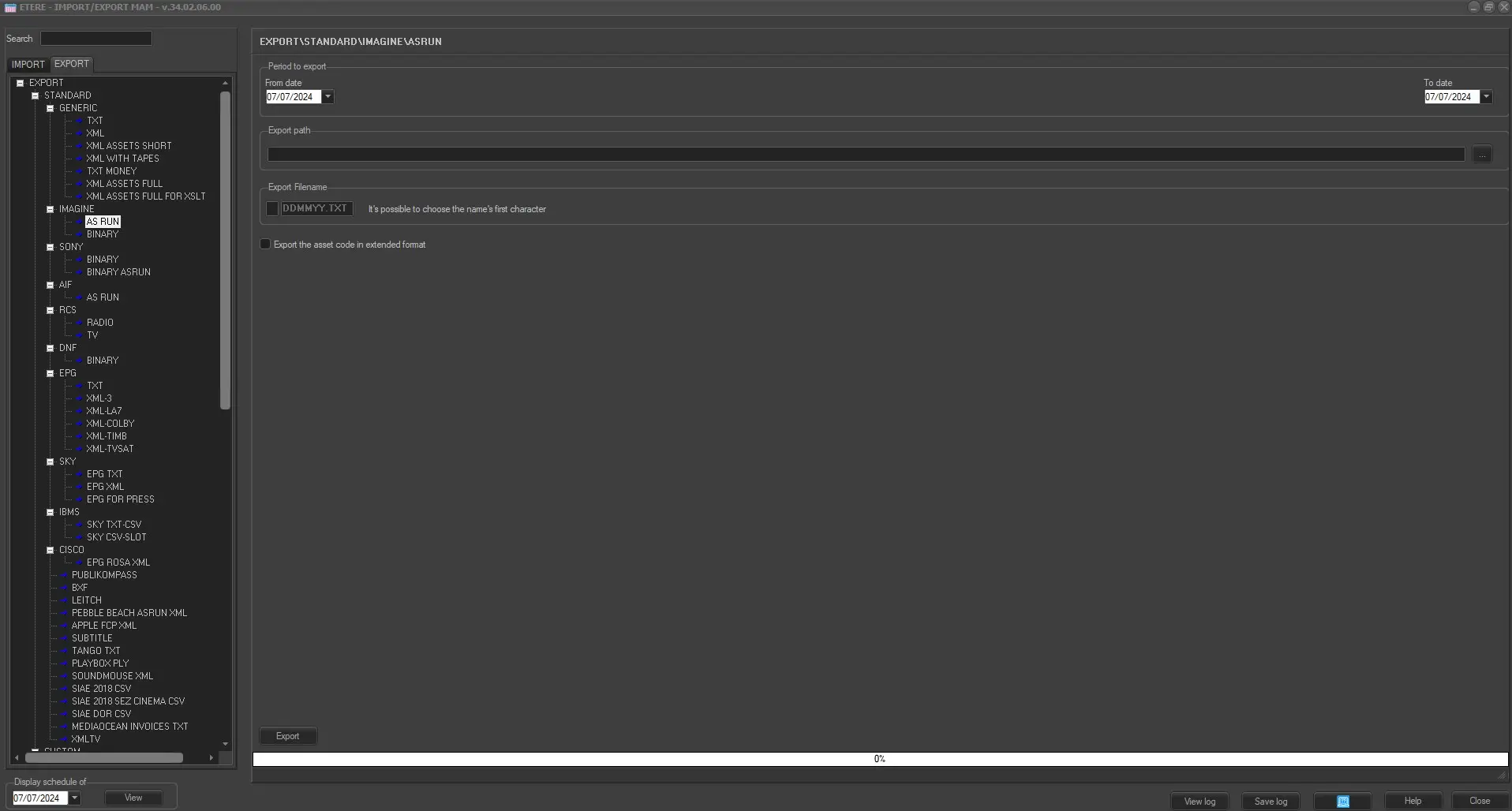 The Imagine As Run export allows, as it names suggests, to generate an as-run log containing the broadcast schedule as it actually is, thus allowing to reconciliate it with the planned schedule since broadcast data that may vary to the published schedule due to delay in broadcast times on-air or last minute schedule changes.